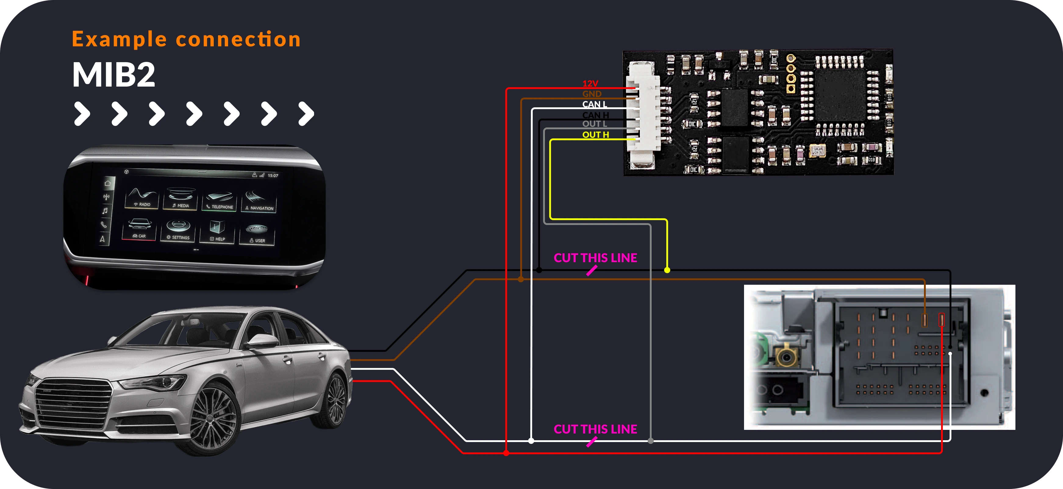 For the MIB2 system to function properly, it is necessary to install an emulator on the MIB unit and the OBD2 port.